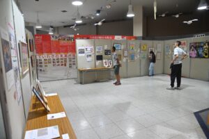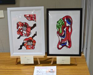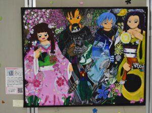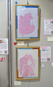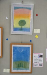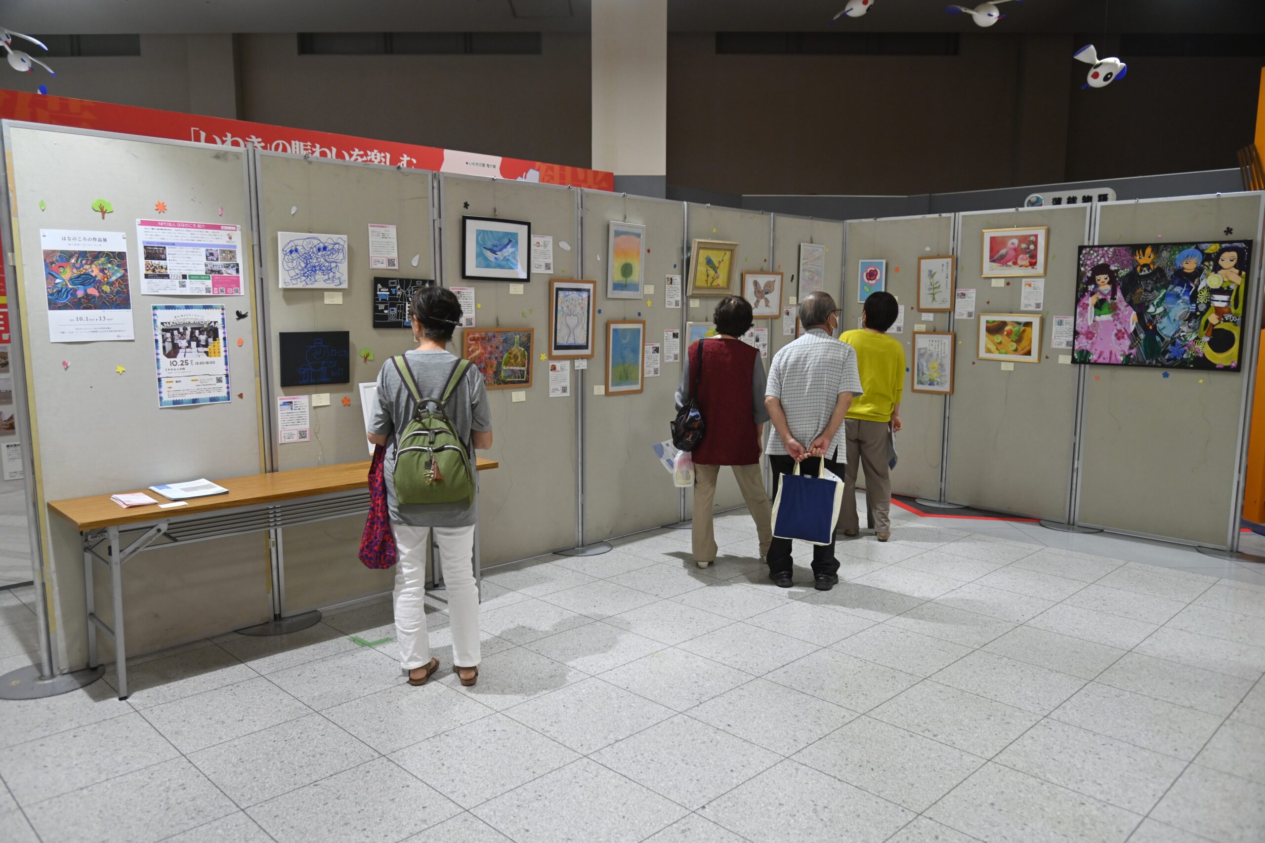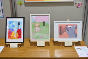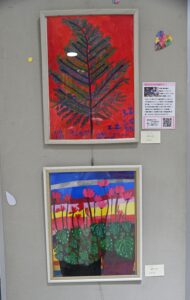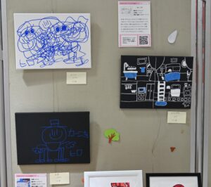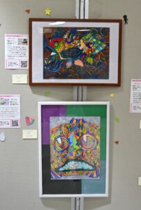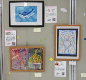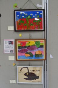 会場は2階の「ライブいわきミュウじあむ」。油絵、アクリル画、水彩画、色えんぴつ画、貼り絵、切り絵、デジタルイラスト画の合わせて35点を展示しています。ゆずゐのシーラカンス、玄太のチョウチンアンコウ、くるんのクラゲ、小野広美の魚群をモチーフにした魚の絵も、開催地の小名浜を感じさせます。