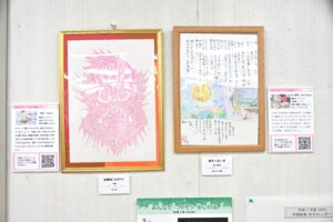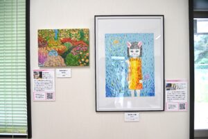 同社は9月から応接室と社員食堂に2点ずつ展示していただきました。櫻井智美の作品は、華やかな花々を彩った油絵「花咲き溢れて」。茶々丸は、擬人化した女の子の猫を描いた色えんぴつ画「花を持った猫」。佐川真海は「フレーフレーあなた」とエールを送る色えんぴつ画「満月に近い月」。千鶴は巧みな技術を感じさせる切り絵「破魔奴(はまや)」。