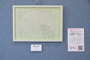 今月から展示する小野広美のペン画「ハロリン」は玄関に飾りました。ハロウィーンのカボチャをモチーフにした「ハロリン」が画面いっぱいにたくさん描かれた小野広美らしい作品。千鶴は切り絵「抱擁-マグダラ-」を応接室に展示。和柄模様を背景に、羽を大きく広げるクジャクを切り絵で表現しています。