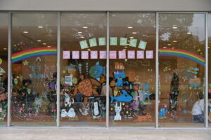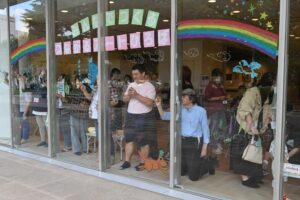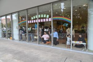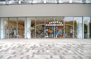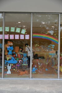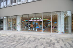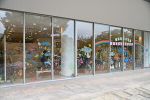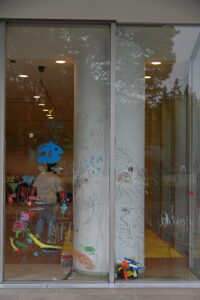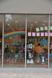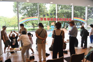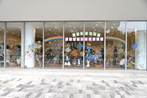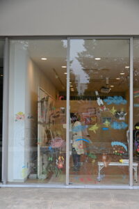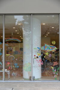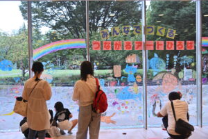 オープニングイベントとなった窓ガラスのお絵描きでは、はなのころメンバーも多数駆け付けました。窓に描いてもすぐに消せるクレヨンのような絵具「キットパス」で、普段は描いてはいけない公共施設の、高さ3メートルはあるであろう大きな窓8面をキャンバスにし、来場者が思いっきりお絵描きしました。