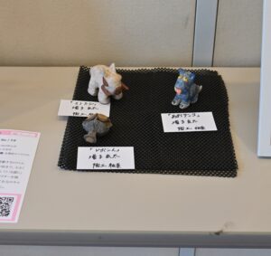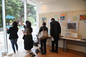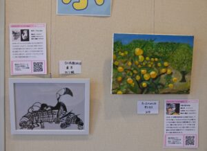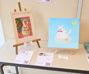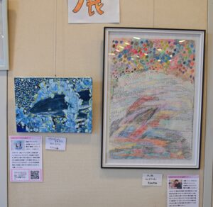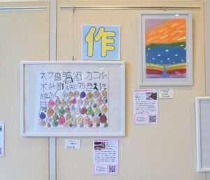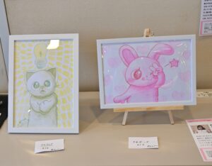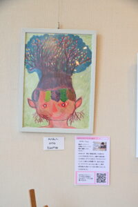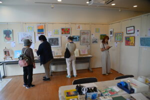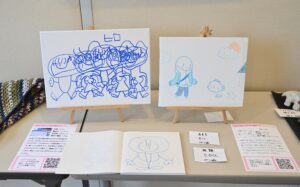 会場はいわきアリオス1階のアートスペースで、遠くは東京都、横浜市からも含めた市内外の約100人が来場しました。はなのころメンバー20人の作品25点を常設で展示した会場に、平中央公園に面するアリオスの大きな窓にみんなでお絵描きする交流や、はなのころメンバーのつばさと一匡の2人によるそれぞれ「ハロウイーンのリース作り」と「古代文字で書く名前シール作り」のワークショップを行いました。イベントディレクターは「はなのころパーク」でもワークショップを担当したもりあゆみさん(もりマルSTORE)が担当しました。
