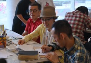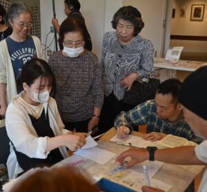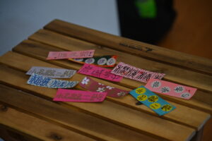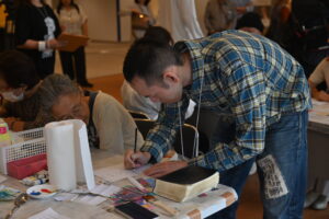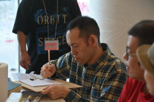 「古代文字でお名前シールを作ろう」では、古代文字で写経する一匡が講師を担当。参加者12人分のテーブルは満席。参加者は自身の名前を書いたメモを見せ、一匡に古代文字を書いてもらいます。すぐに古代文字を書く一匡の特技に驚く声や、「こういう文字になるのね」という声も。一匡は「子どもにも書いてあげたら『学校でみんなに見せたい』と喜んでいた」と嬉しそうに話していました。