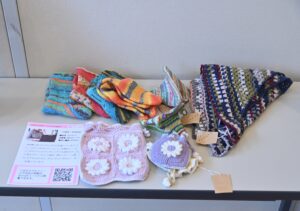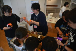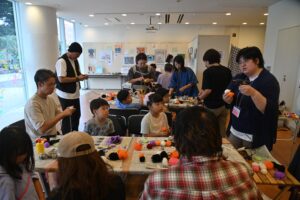 編み物好きのつばさが講師を担当したワークショップ「毛糸でぐるぐる!ハロウィン飾りを作ろう」も、親子連れで満席。つばさは自己紹介した後、リース作りを説明しました。参加者は新聞紙を丸め、それに好きな色の毛糸でグルグル巻き付けます。つばさから優しく説明を受けながら、子どもたちがはしゃぐ声を響かせて楽しんでいました。