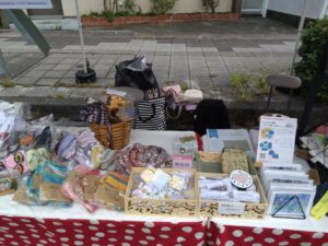 当法人ははなのころメンバーの作品でデザインしたグッズや、はなのころアパレル「8756(ハチナナゴーロク)」のアイテムを並べました。絵を描いている障がいのお子さんを持つ親御さんも訪れ、活動を紹介して今月の交流イベント「はなのころパーク」の案内もしました。はなのころメンバーの通う福祉事業所の職員やメンバーの同級生も訪れ、グッズを見て喜んでいただきました。