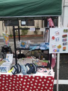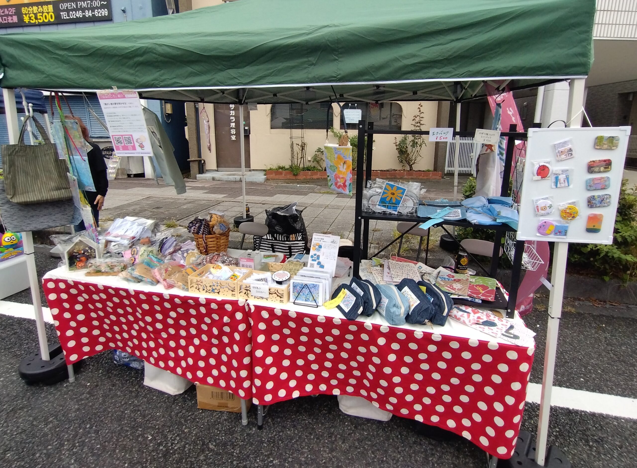 当法人ははなのころメンバーの作品でデザインしたグッズや、はなのころアパレル「8756(ハチナナゴーロク)」のアイテムを並べました。絵を描いている障がいのお子さんを持つ親御さんも訪れ、活動を紹介して今月の交流イベント「はなのころパーク」の案内もしました。はなのころメンバーの通う福祉事業所の職員やメンバーの同級生も訪れ、グッズを見て喜んでいただきました。