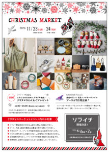 主催はソライチ実行委員会。本格的なクリスマスマーケットとして福島空港公園緑のスポーツエリアを会場に、洋服や革細工、アクセサリー、バッグ、小物などのハンドメイドクラフトのお店100店超が登場。11月23、24の両日開かれ、当法人は初日の23日に出店します。