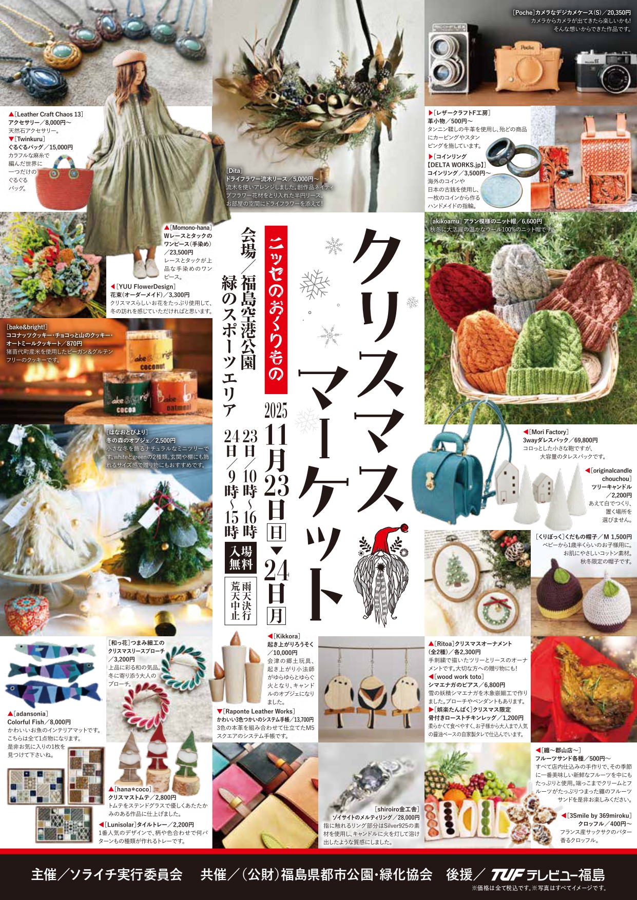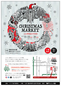 主催はソライチ実行委員会。本格的なクリスマスマーケットとして福島空港公園緑のスポーツエリアを会場に、洋服や革細工、アクセサリー、バッグ、小物などのハンドメイドクラフトのお店100店超が登場。11月23、24の両日開かれ、当法人は初日の23日に出店します。
