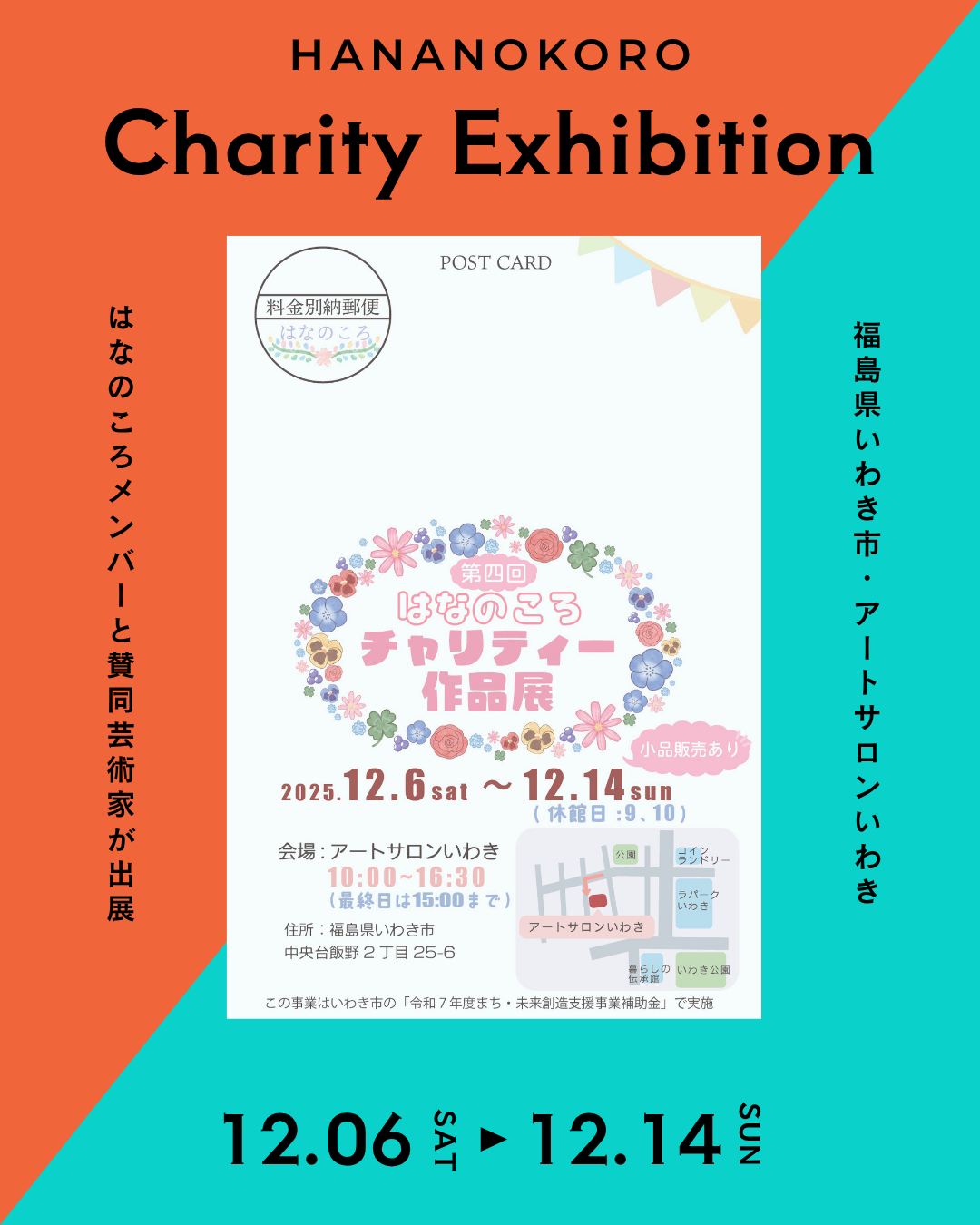 特定非営利活動法人はなのころは来月12月6日(土)10時から、福島県いわき市のアートサロンいわきで「はなのころチャリティー作品展」を開催します。はなのころメンバーの1年を締めくくる恒例の作品展で、市内の賛同していただける芸術家(11月15日時点で34人・末尾に出展者リスト)にも展示していただきます。毎年メンバーも訪れ、作品の発表を通して来場者や芸術家と交流も楽しんでいます。同月14日まで(9、10日は休館)。