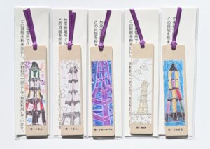 特定非営利活動法人はなのころはこのほど、福島県いわき市の常磐共同火力株式会社からご依頼を受けて同社70周年を記念したノベルティグッズの「しおり」を製作しました。素材は勿来火力発電所で発生する廃棄物の貝殻を有効活用しています。はなのころメンバー4人が同発電所の集合煙突「勿来ゆめライト」を描いた作品で5種デザイン。見学者や地域住民らに配布されています。