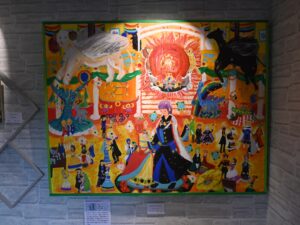 絵画は油彩、水彩、アクリル、色えんぴつ、ペン画を展示。ファンタジックなお城の舞踏会を描いた作品、花や魚をモチーフにした作品などがそろいます。古代文字での写経、切り絵の大作も飾っています。