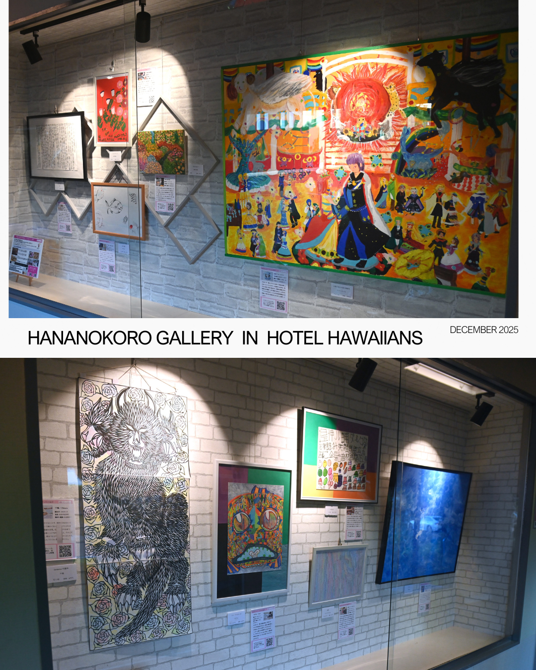 展示場所はホテルハワイアンズ1階(東2号館)の連絡通路。25年1月から展示が始まり、第1期は9人の9作品を、同年4月に入れ替えた第2期も9人の9作品を、途中追加も含めてそれぞれ飾りました。12月15日に入れ替えた第3期は櫻井智美、一匡、ゆずゐ、アオハスバル、小野広美、櫻林健志、ジャンボさかえ、茶々丸、小島敦雄、千鶴の10人です。