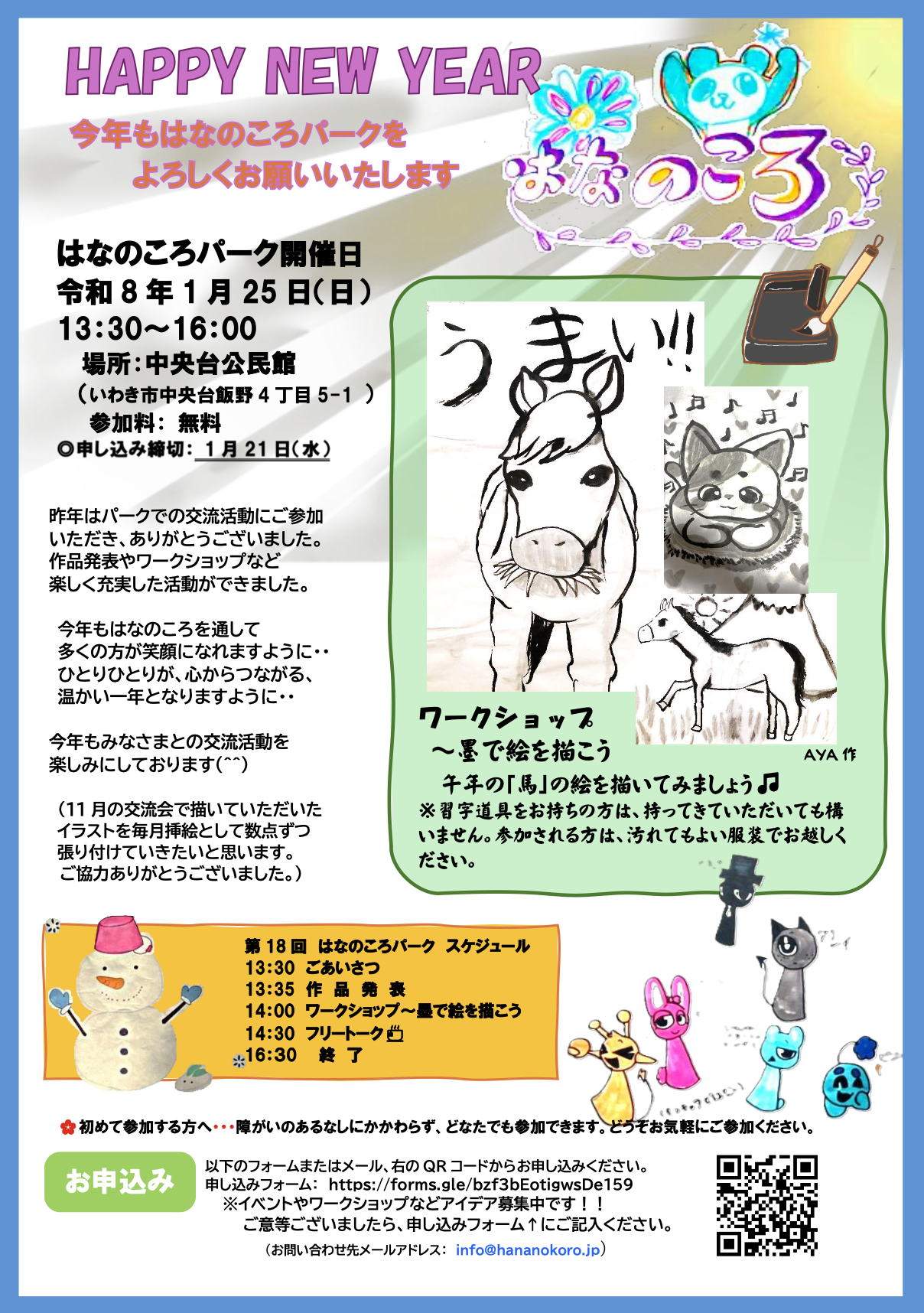 障がいの有無に関わらず交流を楽しむ「はなのころパーク」が今月1月25日(日)13時半から、福島県いわき市の中央台公民館で開かれます。今回は作品発表のほか、ワークショップ「墨で絵を描こう」を予定しています。参加無料。末尾のフォームから申し込みを受け付けます。