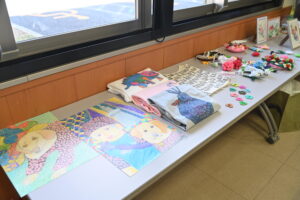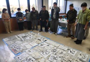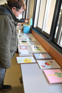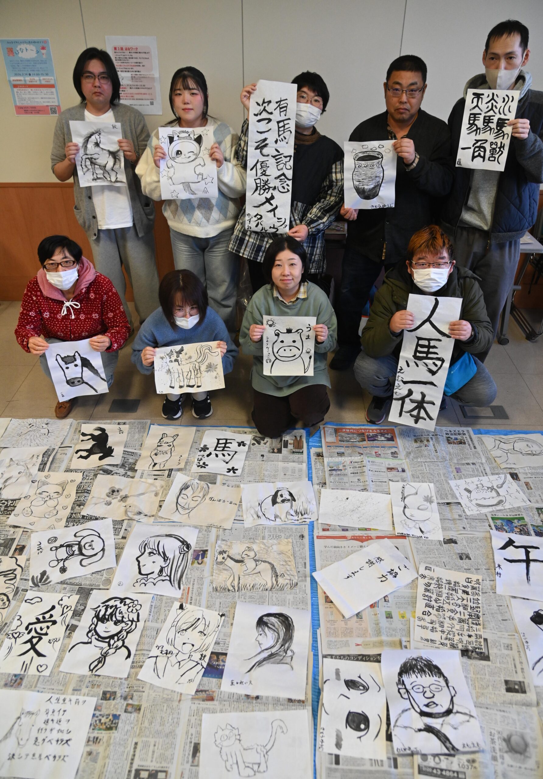 最後、作品を一面に並べてみんなで鑑賞。「馬」や「愛」の文字や人物画、動物の絵などを眺め、感想をお互いに共有しました。