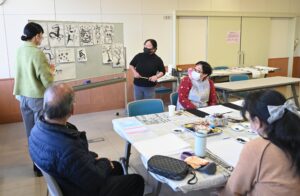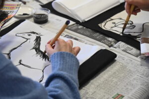 ワークショップでは、はなのころサポーターが案内役となって参加者が墨絵を楽しみました。普段デジタルでイラストを描いている初参加者は、陰影を巧みに表現した力強い馬を描き、みんなから「すごい」と声を掛けられていました。さらに初参加者は偶然知り合いと出会え、久しぶりの会話を楽しんでいました。