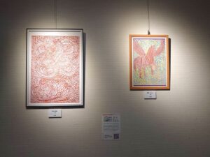 1月27日に入れ替えた今回は千鶴の作品2点。一つはオレンジ色で浮き立つような龍を切り絵にした大作「龍神-開華-」。開いた花と花びらの模様も見応えがあります。もう一つは水彩の点描を背景に羽ばたくペガサスの切り絵「精馬-Pegasus-」。細かい切り込みでペガサスの肌や羽を巧みに表現しています。