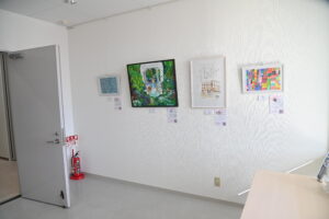 現時点で同事務所のほか、アムーヴ、常光サービス、久工業所、常磐開発に作品を貸し出しています。作家は発表の場と収益が、当法人は活動費がそれぞれ得られ、企業は社内が彩られて社員や来客の目を楽しませることができる仕組みです。同事務所は去年8月から入口前のスペースにレンタル作品4点を展示くださっています。第1期は小野広美、聡美、茶々丸、千鶴、第2期は櫻井智美、えむえむ、ゆずゐ、櫻林健志の作品でした。