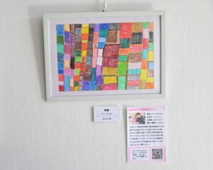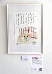 ジャンボさかえはタイル状の模様が色鮮やかな色えんぴつ画。カラフルな模様が美しい抽象画です。幸田真海は「生きる」幸せに気づいた兆しを書いた詩画「光」。愛らしい犬の絵とともに詩を添えています。