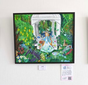 1月28日に入れ替え作業。一匡は古代文字で書き連ねたペン字「魚編の名前」。お寿司屋の湯飲み茶碗の文字を想起させるユニークさを感じさせます。アオハスバルはメルヘンな世界を感じさせる大作のアクリル画「森の庭」。少女と周りにたたずむ小鳥や動物が物語を想像させます。