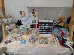 会報誌を配布して、展示活動や交流イベントの取り組みなどを紹介。「福祉と表現」をテーマに開催された「シエント情報交換会」の参加者、相談支援事業所、イラストレーター、社会福祉協議会職員ら、障がい者アートに興味のある方々がお立ち寄り。障がい者アート支援の熱い思いをお話し合ったり、アドバイスをいただいたり、情報交換させていただきました。ほかの出店団体の方々ともお話でき、グッズや作家の情報、活動をおうかがいし勉強させていただきました。