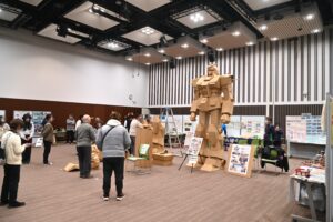 会場では、福祉・環境保護・国際交流・町おこし・子育て・難病などの支援活動の15団体がブースを構えました。段ボールを使って高さ2.3メートルの「戦闘型ロボット」を組み立てるワークショップもにぎわいました。
