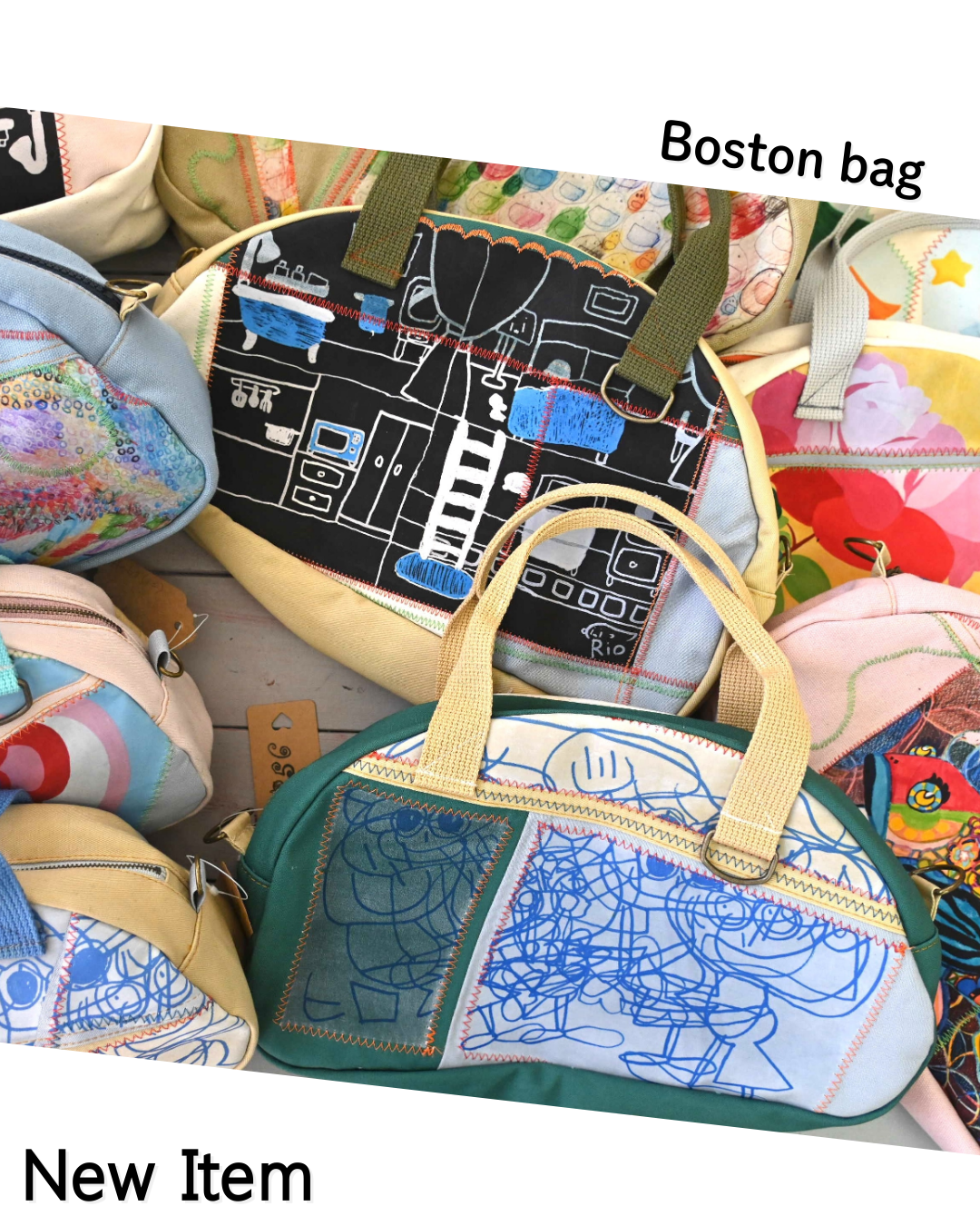 ミニボストンバッグは9種。流線型の丸みを帯びた独特のフォルムのバッグに作品がデザインされ、ミシンを走らせたカラフルな糸で彩りを添えています。