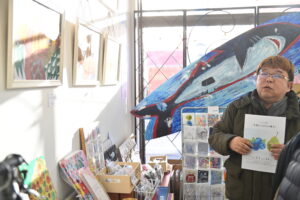 はなのころメンバーのえむえむの個展「えむえむ展Ⅱ『生命(いのち)の輝き』」がこのほど当法人の交流ギャラリースペース「はなのころBASE(ベース)」で開かれました。おととし夏に赤井郵便局で開かれたえむえむ展に続く2回目の個展。今回は3年掛かりで描き溜めたペン画をそろえて展示しました。