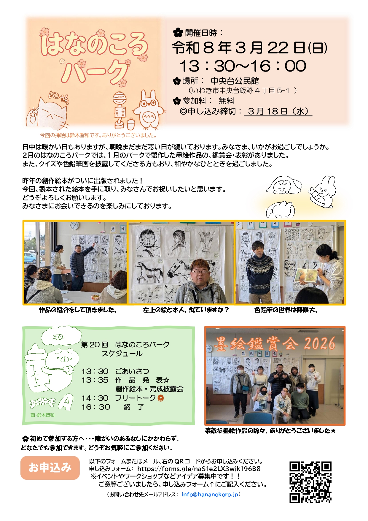 障がいの有無に関わらず交流を楽しむ「はなのころパーク」の第20回が今月3月22日(日)13時半から、福島県いわき市の中央台公民館で開かれます。今回は障がいを持つ作家による作品発表と、最近製本した「はなのころ」の絵本の完成披露会、フリートークを予定しています。参加無料。末尾のフォームから申し込みを受け付けます。
