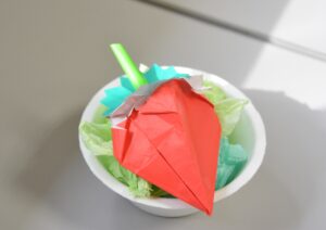 作品の発表では5人が登壇。人と会話するのが苦手だったお子さんも初めて発表に挑みました。その日の朝に折り紙を楽しんでいた際「これを発表したい」と母親に話したといいます。発表では会場から「頑張れ」の声援を受け、お母さんと一緒に参加者の前に立ち、イチゴの折り紙作品を披露。お母さんが代わりに説明し、お子さんはすぐに席に戻りましたが大きな一歩を見せ、参加者から大きな拍手を受けていました。
