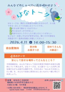 交流ギャラリースペース「はなのころBASE(ベース)」(愛称・はなベー)での定例おしゃべりイベント「はなトーク」の第15回が4月11日14時から開かれます。テーマは「安心して話せる場所ってどんなところ?」。参加無料で要申し込み、定員10人。