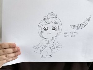 初参加者はラディッシュをモチーフにした妖精のキャラクターを仕上げ「こういうキャラを描きたかった」と喜んでいました。別の初参加者はデコポンでかわいい女の子キャラをデザイン。デコポンの突起した頭部をお団子頭にした発想を見せました。他にも、エンドウマメのキャラクターを描いた参加者もいました。