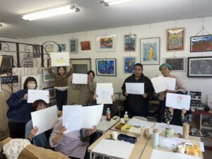 3月28日に開催。はなのころサポーターが案内役を務め、初参加3人を含めた8人が参加しました。講師は前回と同様にイラストレーターの「猫社長きいちゃん」が担当しました。