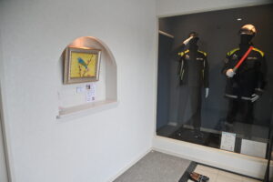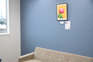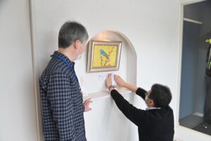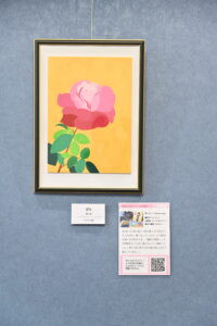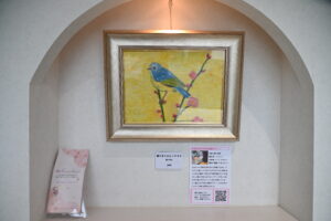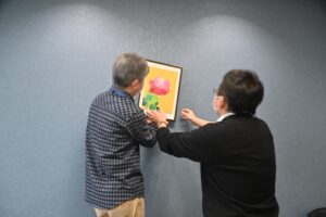 今月から展示する作品は2点。応接室には茶々丸のアクリル画「ばら」を、玄関には櫻井智美の油彩画「陽だまりのルリビタキ」を展示しました。入れ替え作業をしたのはソーシャルスクエア上荒川店のご利用者様で、メンバーの作品をしっかりと飾っていただきました。