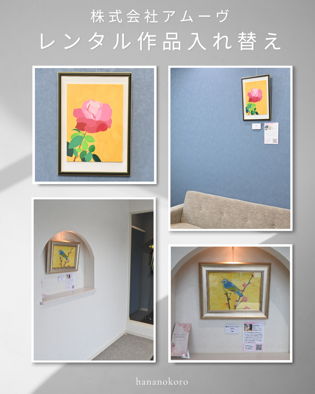 当法人が絵画をレンタルしている株式会社アムーヴ(福島県いわき市)でこのほど作品を入れ替えました。4月から6月までとなる第7期は櫻井智美と茶々丸の作品です。