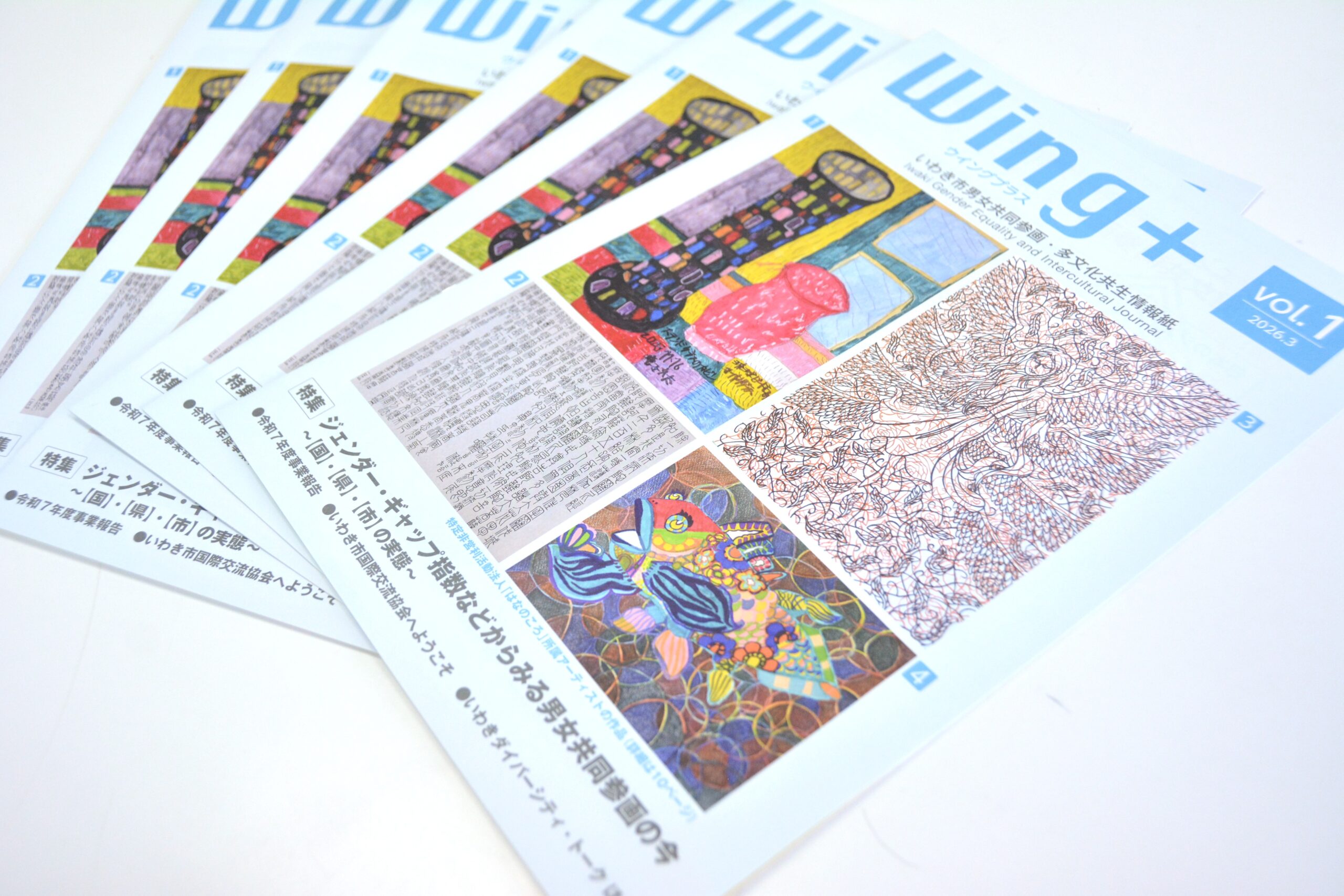 いわき市男女共同参画・多文化共生情報紙がこのほど「Wing +(ウイングプラス)」としてリニューアル発行され、はなのころメンバーの一匡、ゆずゐ、玄太、千鶴の4人の作品が表紙を飾りました。1万部印刷され、行政、教育機関、関係企業などに配布されています。いわき市文化センター内の市男女共同・多文化共生センターでも市民に配布されています。