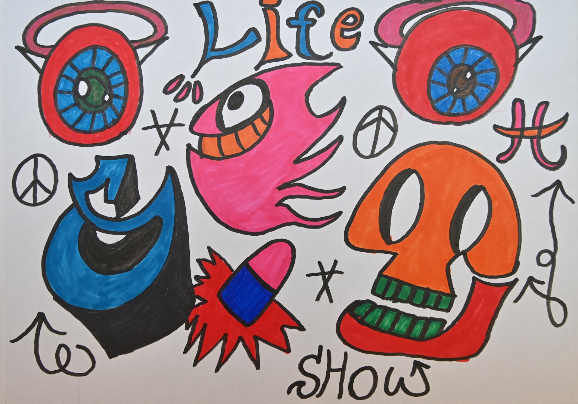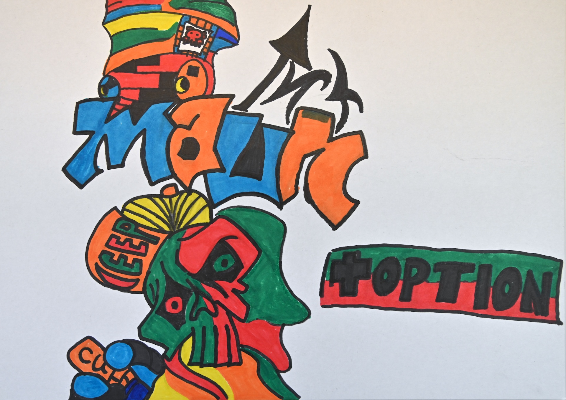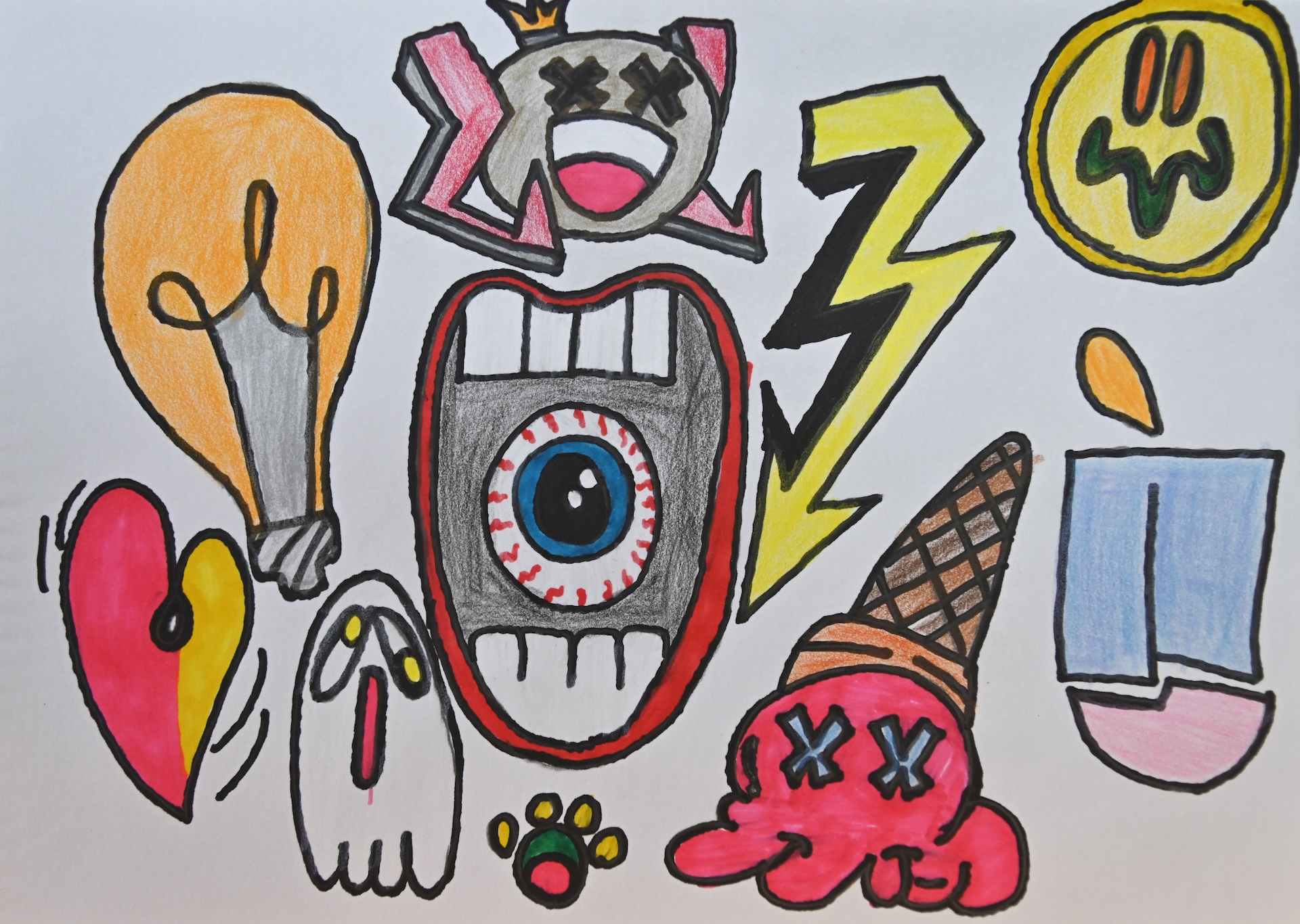| 得意な表現 | 最近は模様のような感じ。ドクロ、稲妻マーク、笑っている顔などをモチーフを描く。いろんなものを混ぜたら面白いかなと思い。ドクロ描きやすい、形が惹かれやすく、ドクロは丸だけでなくおにぎりみたいな形もあって奥が深い。ローマ字が好き。ストリート系に憧れ。スプレーで壁画を描いたこともあった。じいちゃんと大きなベニアを買ってスプレーアートをしたことも。お祖父さんに絵を教わっていた。 |